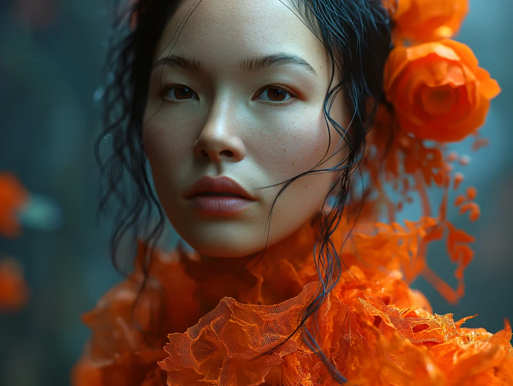 photography by marcus eduard, in the style of layered mesh, young asian woman, daz3d, orange, intricate, biomorphic, anastasiya dobrovolskaya, organic texture
